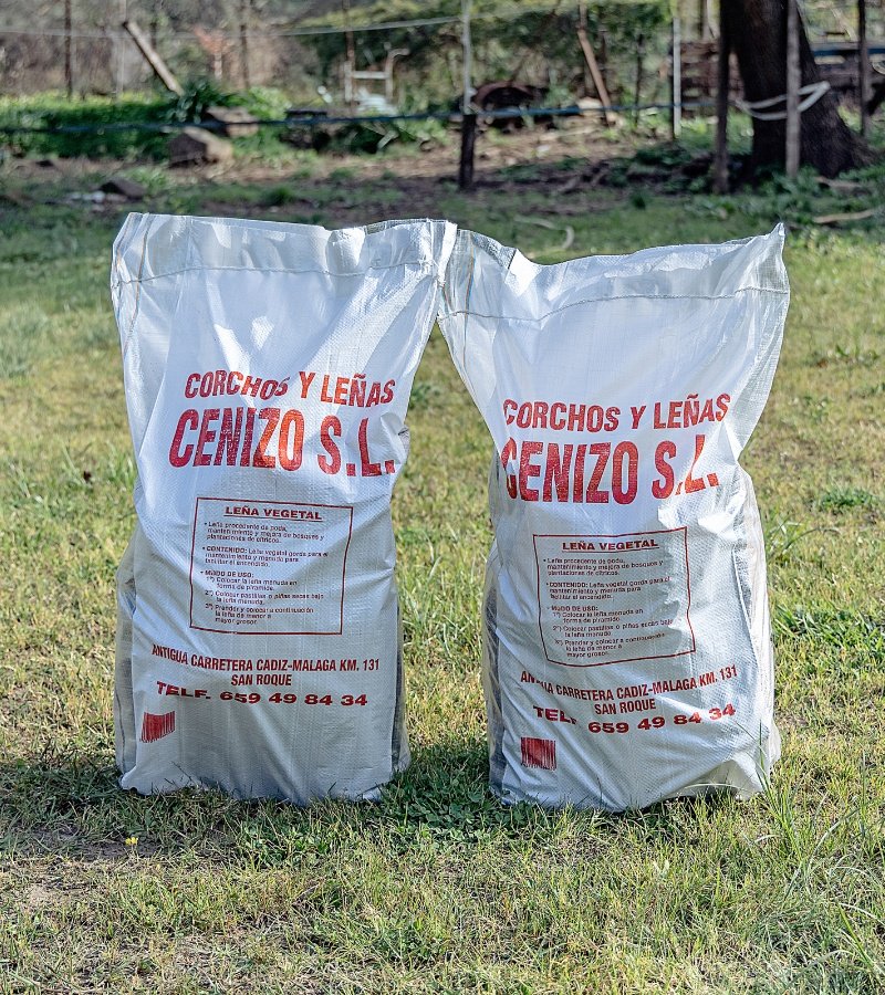 Leña vegetal procedente de poda y mantenimiento de bosques y plantaciones de cítricos. Mezcla de leña gruesa y menuda para facilitar el encendido. Saco de aproximadamente 15 kg. Entrega a domicilio en Campo de Gibraltar y Costa del Sol.