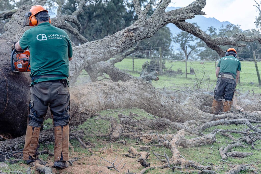 Extracción artesanal de la corteza del alcornoque durante la campaña de verano, respetando los turnos de saca y los protocolos de descorche que garantizan la salud del árbol y la calidad de la plancha.